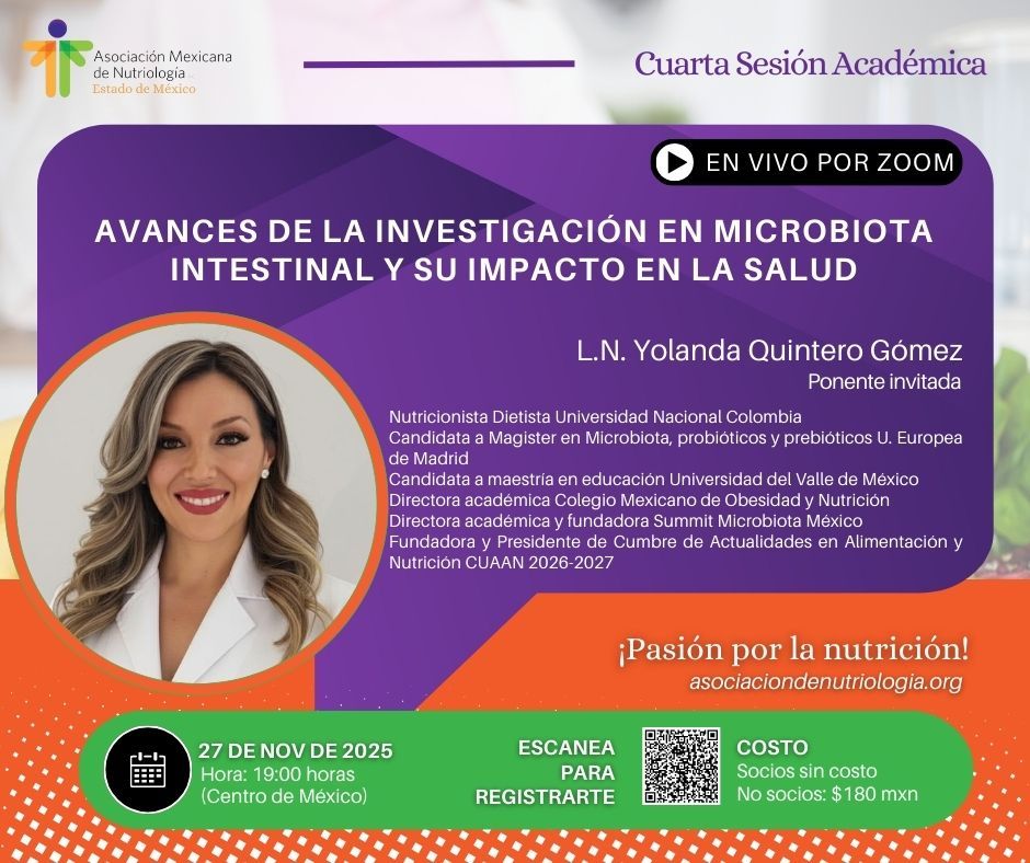 La Asociación Mexicana de Nutriología A.C. Representación Estado de México, te invita a participar en su cuarta sesión académica: “Avances de la investigación en microbiota intestinal y su impacto en la salud”.