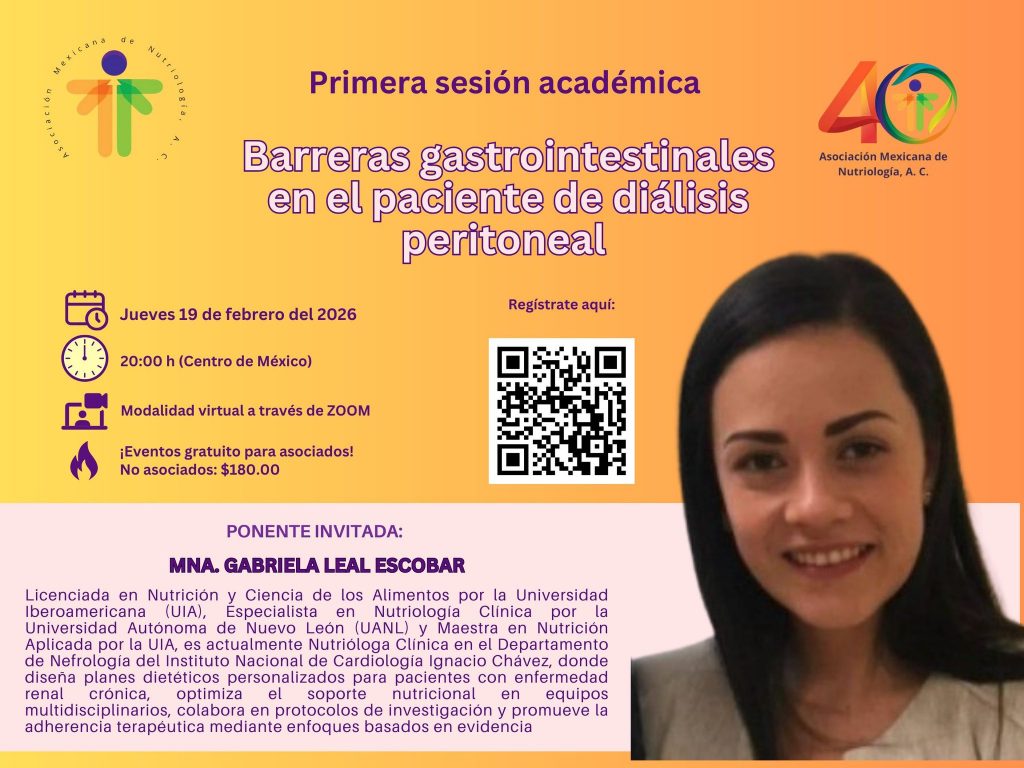 La Asociación Mexicana de Nutriología, A. C. te invita a participar en su Primera Sesión Académica 2026, con el webinar:“Barreras gastrointestinales en el paciente de diálisis peritoneal”