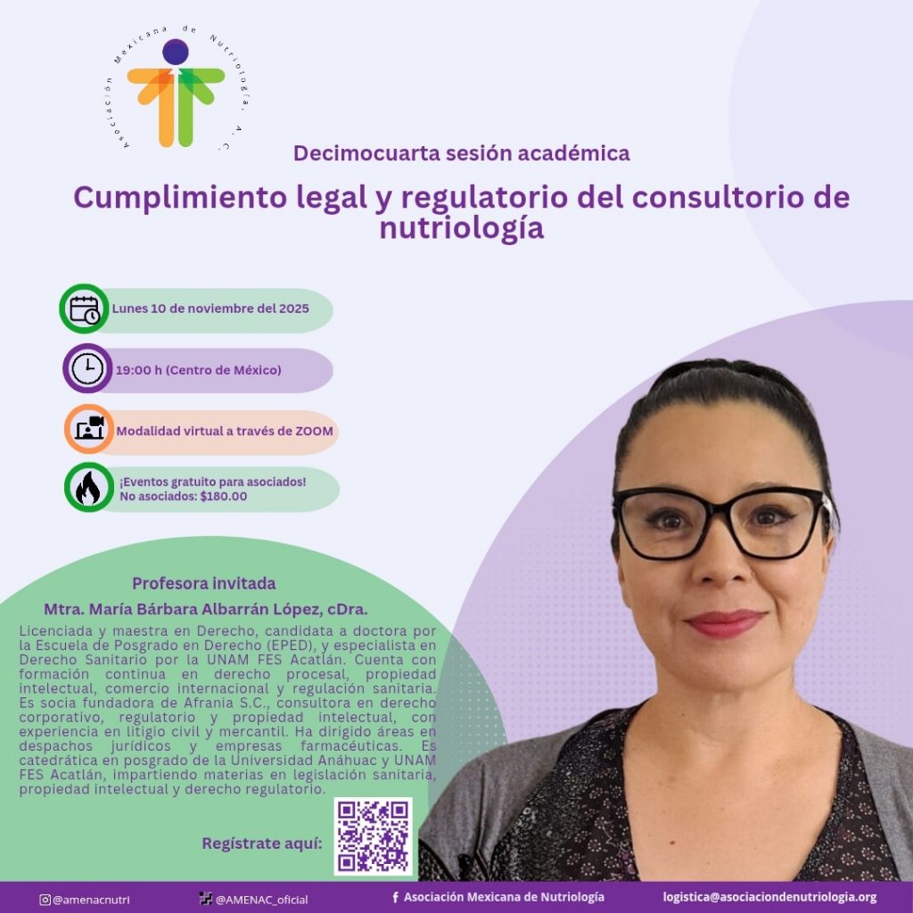 La Asociación Mexicana de Nutriología, A.C. te invita a su Decimocuarta Sesión Académica: “Cumplimiento legal y regulatorio del consultorio de nutriología”
