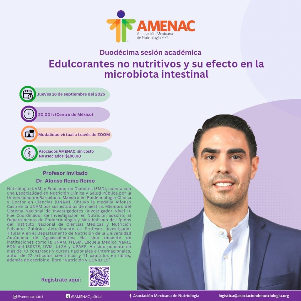 La Asociación Mexicana de Nutriología, A. C. te invita a su duodécima sesión académica: Edulcorantes no nutritivos y su efecto en la microbiota intestinal