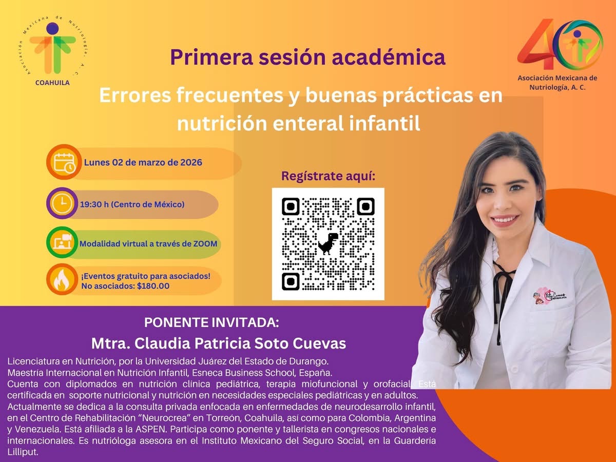 La Asociación Mexicana de Nutriología A.C. – Representación Coahuila te invita a participar en su: Primera Sesión Académica 2026 «Errores frecuentes y buenas prácticas en nutrición enteral infantil”