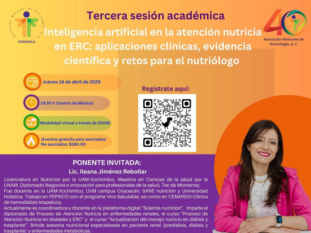 La Asociación Mexicana de Nutriología A.C. Representación Coahuila te invita a participar en su Tercera Sesión Académica 2026:“Inteligencia artificial en la atención nutricia en ERC: aplicaciones clínicas, evidencia científica y retos para el nutriólogo”