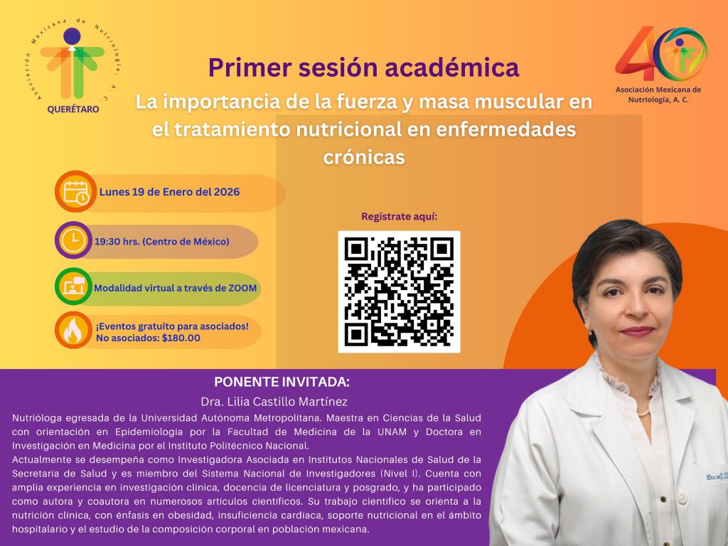 La Asociación Mexicana de Nutriología Representación Querétaro te invita a participar en su Primera Sesión Académica 2026 celebrada en el marco del 40° Aniversario del Día del Nutriólogo en México con el Webinar: “La importancia de la fuerza y masa muscular en el tratamiento nutricional en enfermedades crónicas”