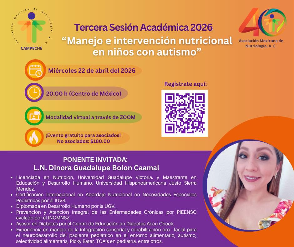La Asociación Mexicana de Nutriología Representación Campeche te invita a participar en su Tercera Sesión Académica 2026 con el Webinar “Manejo e intervención nutricional en niños con autismo”