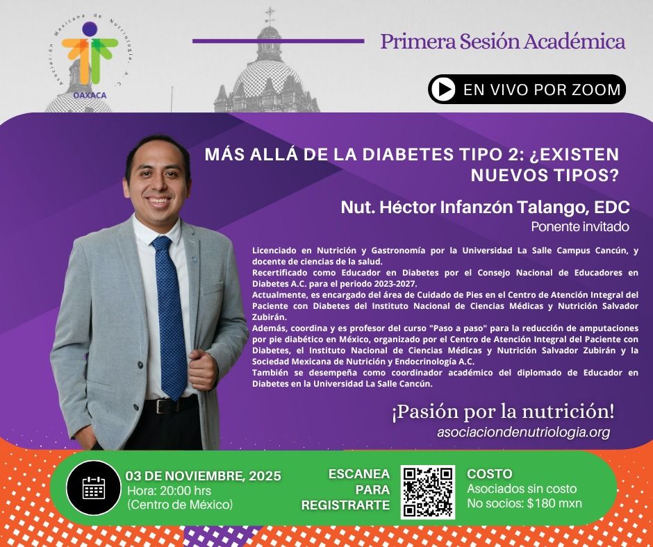 La Asociación Mexicana de Nutriología A.C. Representación Oaxaca, te invitan a participar en su primera sesión académica titulada: «Más allá de la diabetes tipo 2 ¿existen nuevos tipos?»