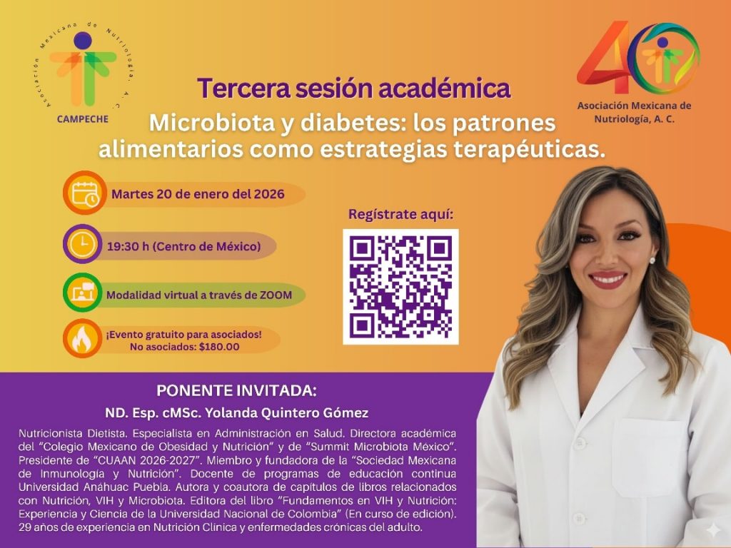 La Asociación Mexicana de Nutriología en colaboración con la Representación Campeche te invita a participar en la Tercera Sesión Académica 2026 celebrada en el marco del 40° Aniversario del Día del Nutriólogo en México» con el Webinar “Microbiota y diabetes: los patrones alimentarios como estrategias terapéuticas”