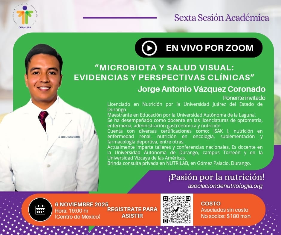 La Asociación Mexicana de Nutriología A.C. Representación Coahuila, te invita a participar en su 6a sesión académica: «Microbiota y salud visual. Evidencias y perspectivas clínicas».