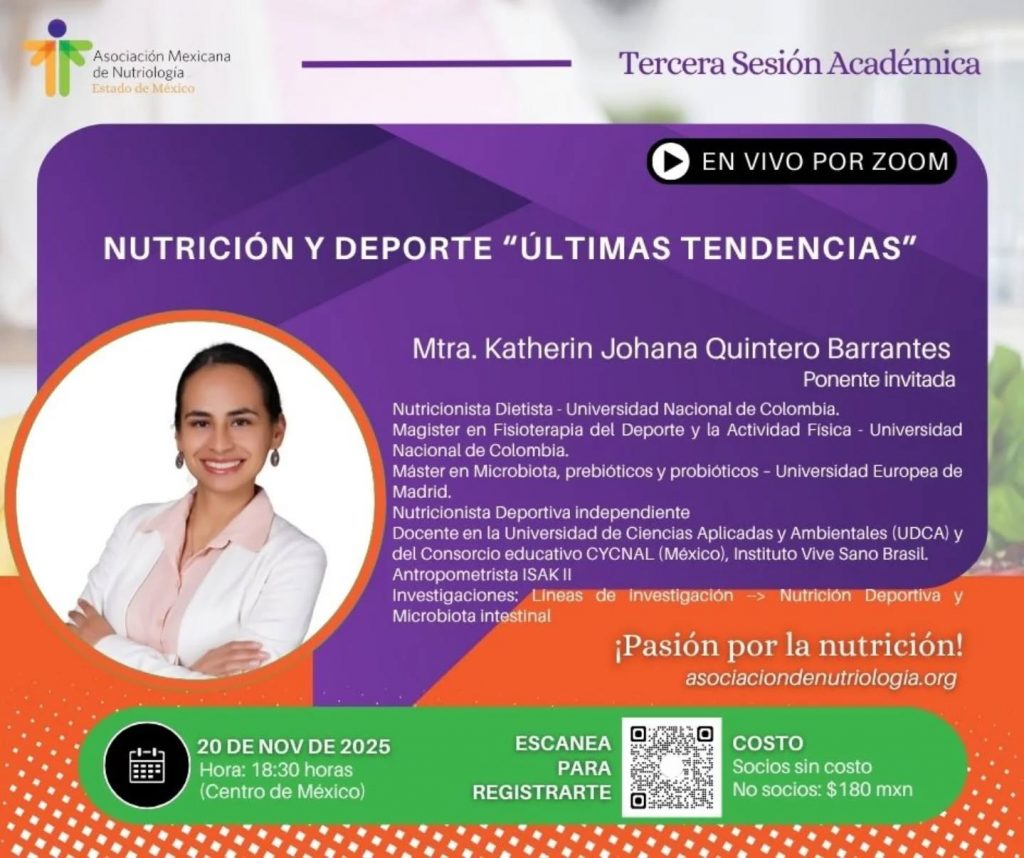 La Asociación Mexicana de Nutriología A.C. Representación Estado de México, te invita a participar en su tercera sesión académica: “Nutrición y Deporte: últimas tendencias”.