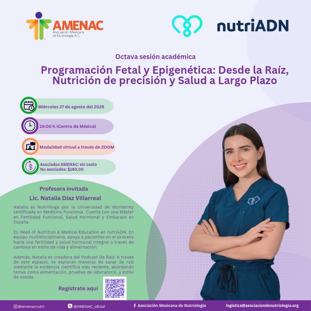 La Asociación Mexicana de Nutriología, A. C. en colaboración con nutriADN te invita a su octava sesión académica: Programación Fetal y Epigenética: Desde la Raíz, Nutrición de precisión y Salud a Largo Plazo